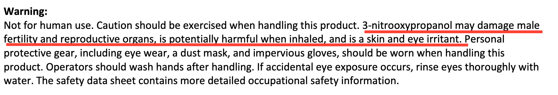 It stated: “In relation to safety studies for the consumer, a 2-year carcinogenicity study in Wistar rats showed “mesenchymal cell tumours were reported in 4 out of 49 females at the top dose of 300 mg/kg bw/day of 3-NOP given orally. Based on these results, the original study report concluded there was evidence of carcinogenicity in female rats.”