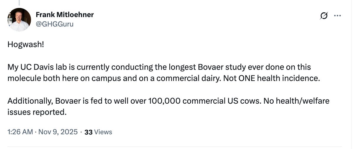 In a public rebuttal, Frank Mitloehner, Professor of Animal Science at UC Davis and Director of the Clarify Center for Enteric Fermentation Research, posted on X ”Hogwash!”—dismissing viral claims of Bovaer-related cow health issues in Denmark by highlighting his lab’s ongoing research and widespread U.S. usage data.