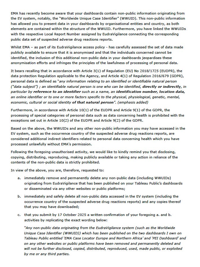 But Aukema’s efforts to bring transparency to this public data have come at a cost. Just a day before his conference presentation, he discovered an email from the EMA in his spam folder, with a subject line that sent chills: “Request to immediately delete non-public information originating from the EudraVigilance system and made available on the dashboards you have on Tableau Public.”