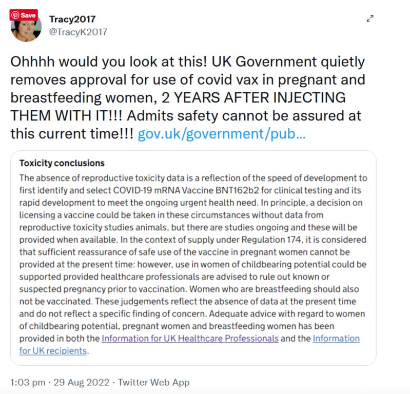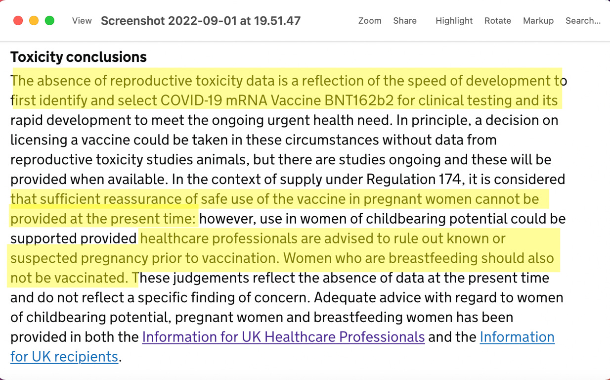 Across the pond in the UK, this significantly contradictory pattern of advice to pregnant women has been the same. The public assessment report of Pfizer-BioNTech COVID-19 vaccine (BNT162B2) which was only recently updated as of 16 August 2022, includes the alarming toxicity conclusions on page 21 of the document.