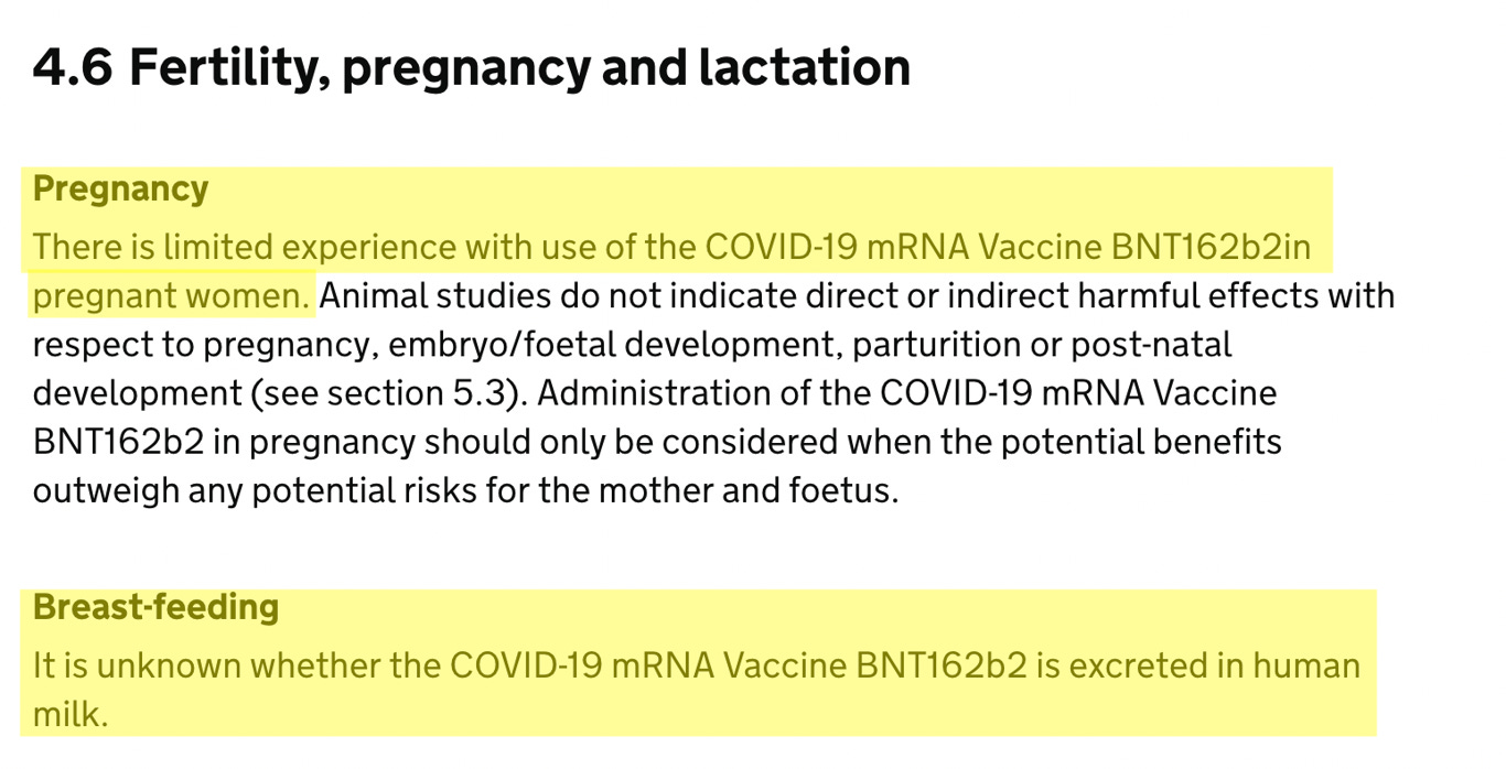 Just like the FDA, the MHRA makes a similar conclusion of there being insufficient data to authorise the safe use of the vaccine in pregnant women. However, the MHRA goes even further by stating that ‘healthcare professionals are advised to rule out known or suspected pregnancy prior to vaccination. Women who are breastfeeding should also not be vaccinated.’