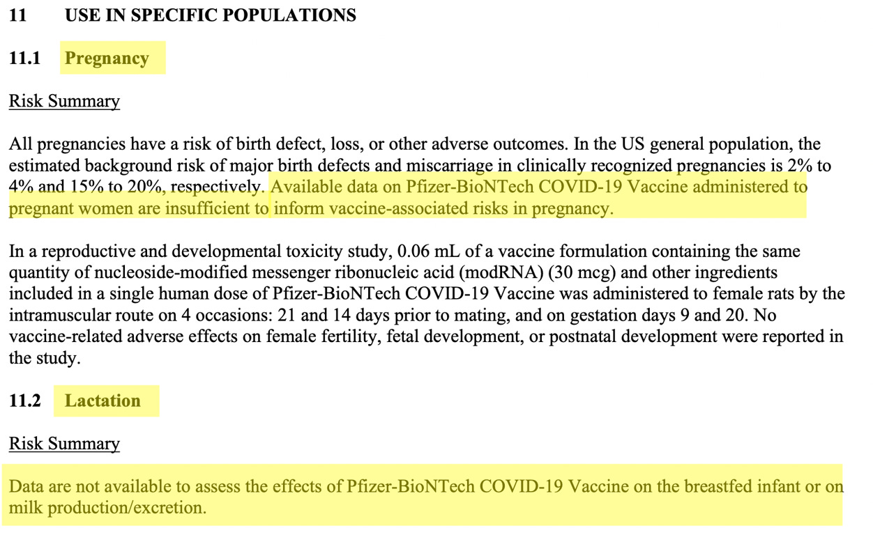 Not only is the fact, 'available data on Pfizer-BioNTech COVID-19 vaccine administered to pregnant women are insufficient to inform vaccine-associated risks in pregnancy', there's none available 'to assess the effects of Pfizer-BioNTech COVID-19 vaccine on the breastfed infant or on milk production/excretion.'