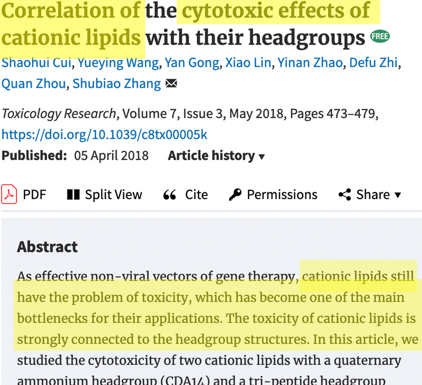 ALC-0315 is a cationic lipid. There’s extensive scientific literature which states that this type of lipid is toxic, see screenshot below.
