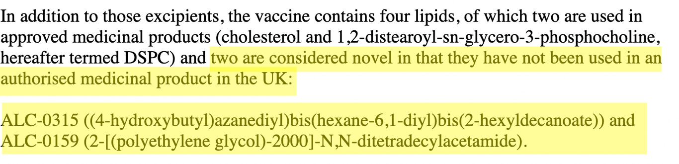 It’s also worth noting that in the MHRA’s Public Assessment report for the Pfizer-BioNTech COVID-19 vaccine it states that two of the four lipids that the vaccine contains are ‘novel in that they have not been used in an authorised medicinal product in the UK.’