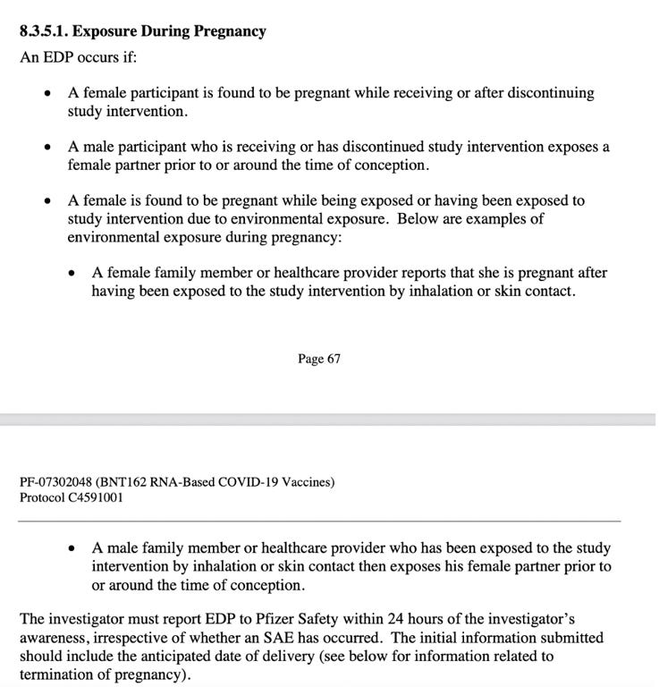 In Pfizer's own clinical protocol, the criteria for exposure during pregnancy (EDP) is described in great detail on page 67-68, implying that exposure of pregnant women to the study intervention (vaccine) was something Pfizer and BioNTech were concerned about. Given that no reproductive toxicity or genotoxicity reports were ever done, perhaps there was something of concern on their radar. What is shocking is that the intramuscular injection of the study intervention was not the only form of exposure which concerned them but the possibility of vaccine shedding, too.