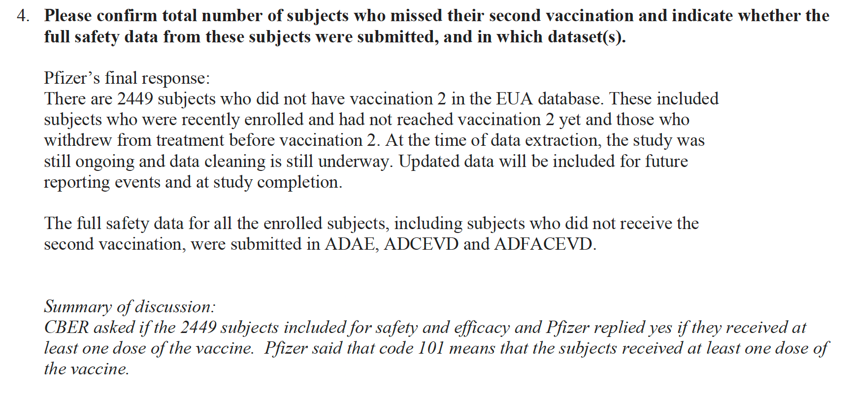 The screenshot below is taken from a telephone conversation record (conducted via WebEx) of the November 25, 2020, teleconference between Pfizer and the FDA’s CBER. It summarizes 12 dataset-related questions from Captain Smith’s November 24 email. In particular, two issues stand out: the 2,449 subjects who missed their second dose and the exclusion of over 3,000 unconfirmed COVID-19 cases.