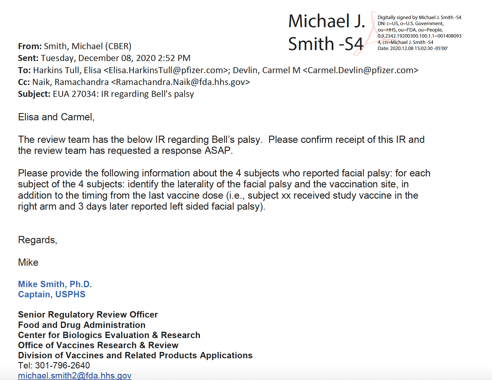 The email dated December 8, 2020, from Captain Michael Smith of the Center for Biologics Evaluation & Research (CBER) to two Pfizer employees, urgently requesting the missing information on four participants from Pfizer-BioNTech COVID-19 vaccine phase III trial (study C4591001), who reported facial palsy (Bell’s palsy) is noteworthy for several reasons. Firstly, the email requesting Pfizer for a response “ASAP” was sent just three days before EUA was granted. This points to the intense rush in reviewing Pfizer’s submissions and raises serious questions over the trial’s data integrity.
