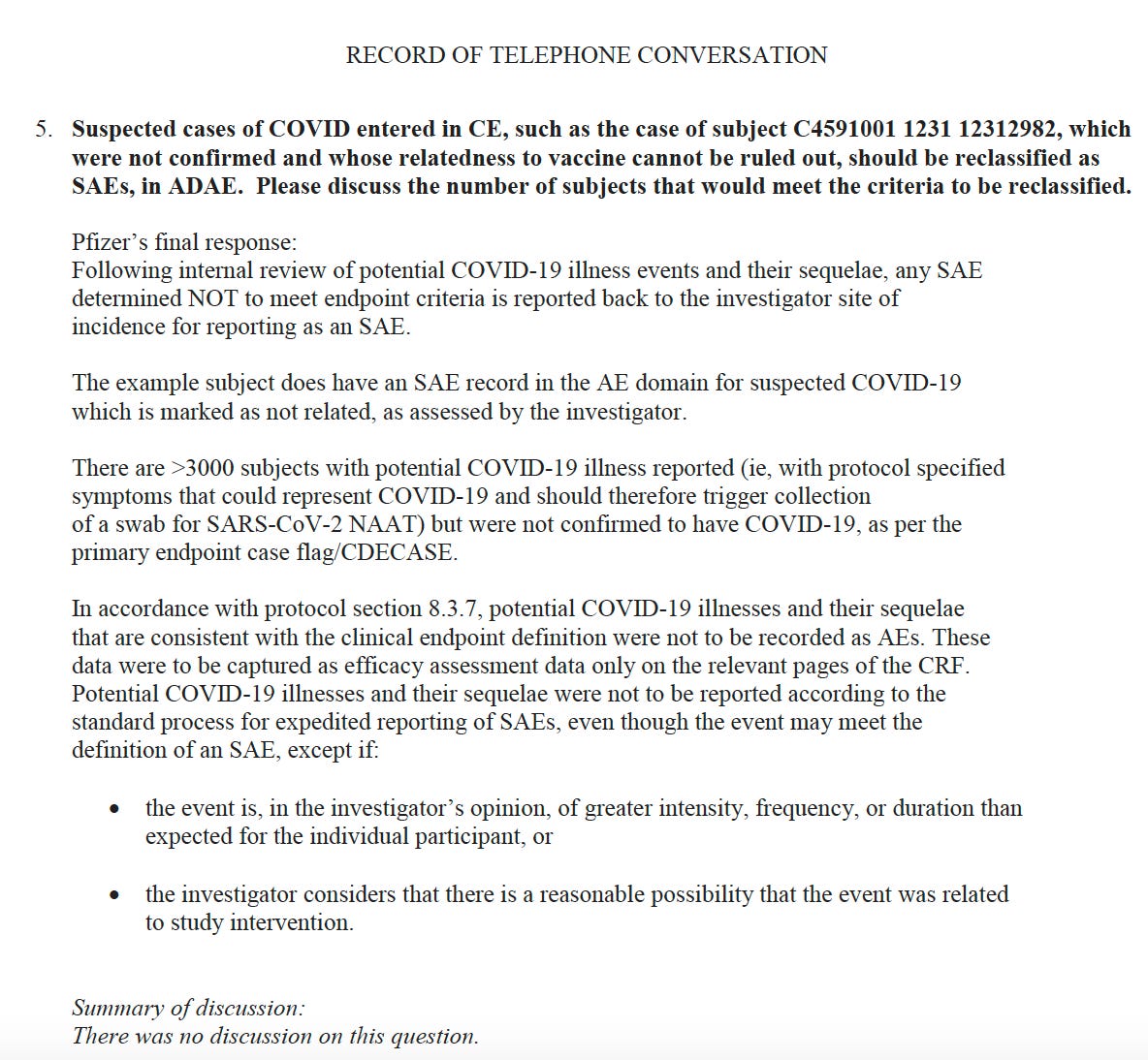 The screenshot below is taken from the same telephone conversation record between Pfizer and the FDA’s CBER. Pfizer’s response to CBER’s question 5 states that over 3,000 subjects reported potential COVID-19 symptoms prompting nucleic acid amplification test (NAAT) swabs but were not confirmed as meeting the primary endpoint case flag (CDECASE), defined as a PCR-confirmed COVID-19 case with symptoms occurring at least 7 days after the second dose.