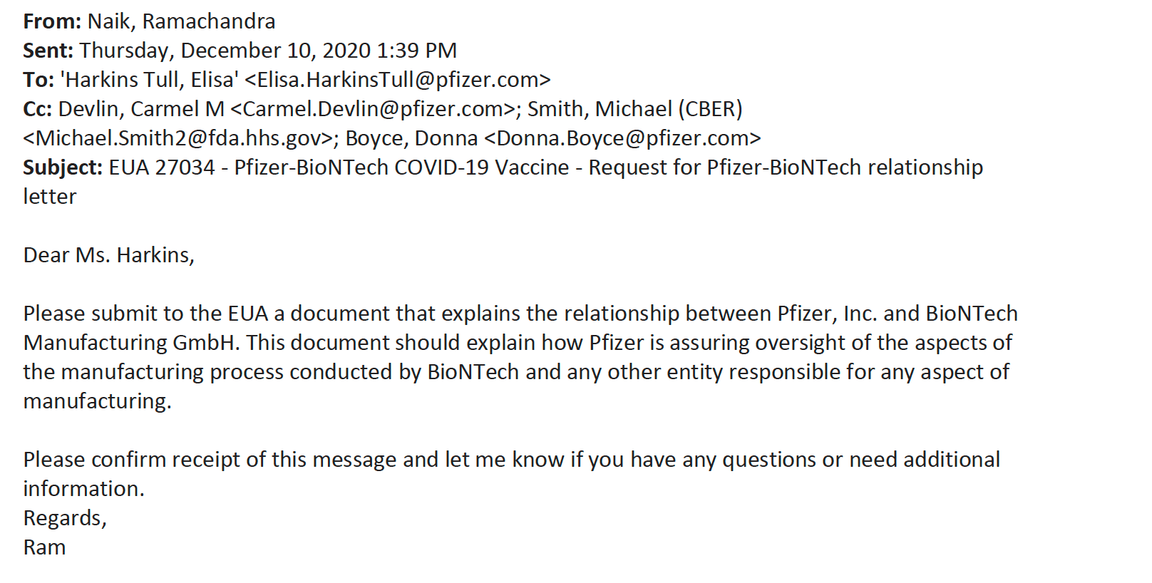On December 10, 2020, one day before the FDA granted EUA for the Pfizer-BioNTech COVID-19 vaccine, Ramachandra Naik, Ph.D., a primary reviewer at the FDA’s Center for Biologics Evaluation and Research (CBER), Office of Vaccines Research and Review, sent an email to Pfizer’s Elisa Harkins Tull requesting a document clarifying the relationship between Pfizer, Inc. and BioNTech Manufacturing GmbH.
